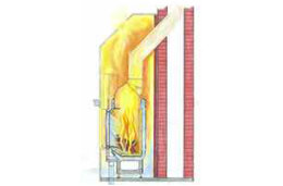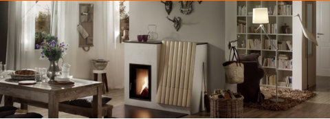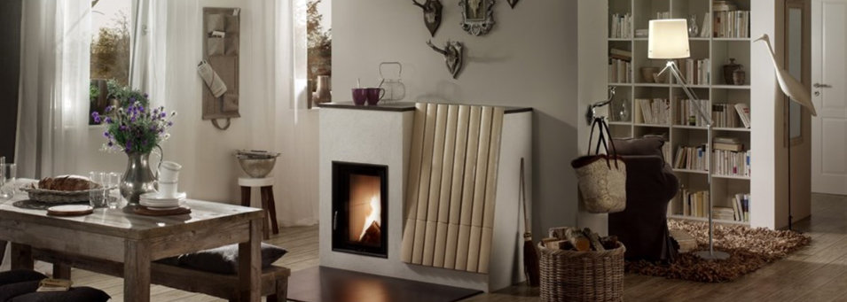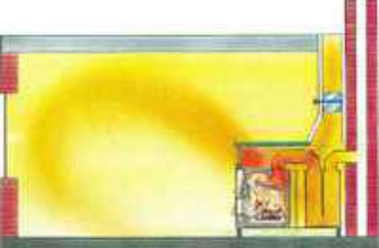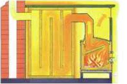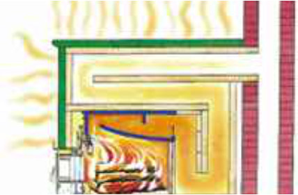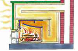 Dieses Konstruktionsprinzip bietet sichtbaren Feuergenuss hinter einer beweglichen Glasscheibe und nachhaltige Wärmeabgabe.Je nach Wunsch werden auf den Kamin Nachheizflächen gesetzt oder sogar keramische Züge hintermauert, die lang anhaltende Strahlungswärme bewirken, ähnlich wie beim Kachelofen. Hierbei wird der größte Wirkungsgrad auch für Kamine erreicht.