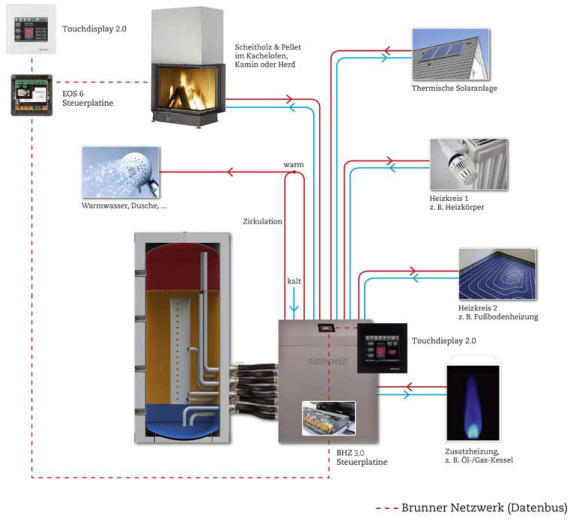 Die Firma BRUNNER hat wie kein anderer Hersteller über 20 Jahre Erfahrung in der Kombination von Holz- und Sonnenenergie.Dieses laufend perfektionierte Wissen macht es möglich, die wohl ausgereiftesten Produkte wie die BRUNNER Heizzentrale bzw. Heizregelung zu entwickeln.Es gibt wohl keine einfachere, bequemere und verständlichere Bedienung einer Heizung als bei der Heizungssteuerung von BRUNNER. Über ein schickes Touch- Farbdisplay sind alle Einstellungen logisch und kinderleicht vorzunehmen oder zu verändern.